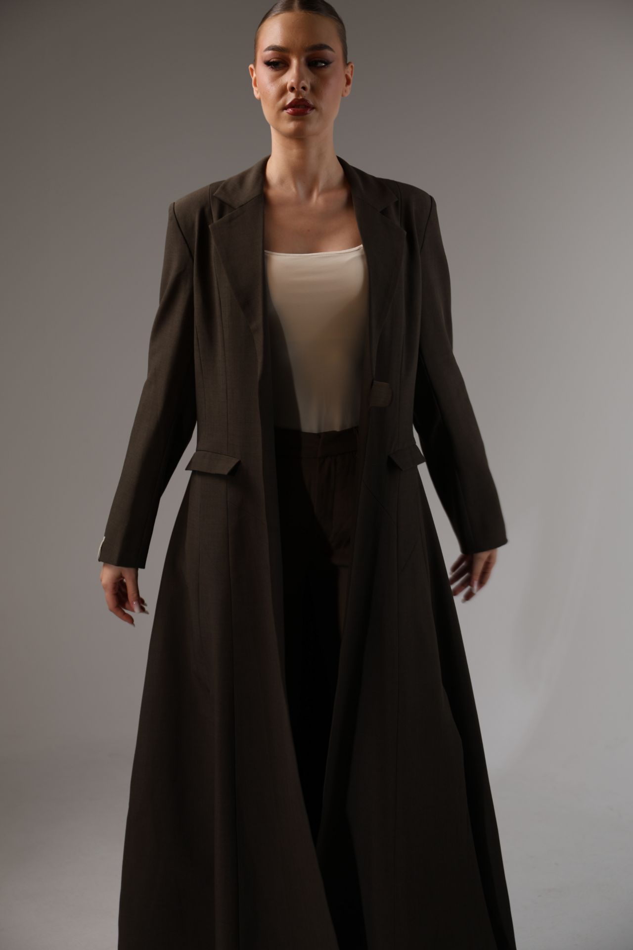 معطف طويل بتفصيل أنيق معطف مصمم بدقة بألوان ترابية غنية. يتميز بياقات انسيابية وقَصّة نظيفة. قطعة أنيقة وعملية، مثالية للعمل والمناسبات الخاصة